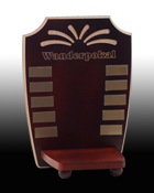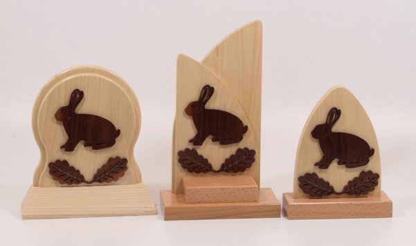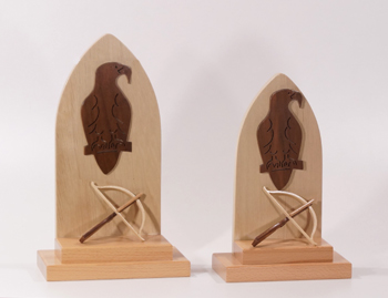 | Pokal rechts: Sockel Buche dunkel, Trägerplakette Weißbuche, Figur Buche |