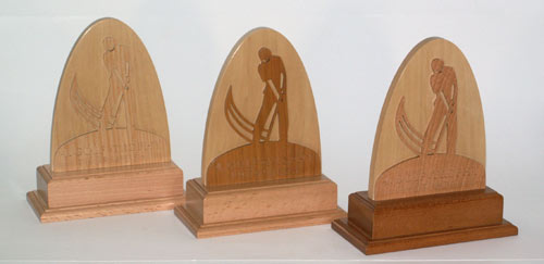 Pokale für die Sportart Golf (auch andere Sportarten möglich) Rechtecksockel, darauf 4 Vierkanntsäulen und Zwischenplatte, als Krone ein Golfspieler. Pokal komplett aus Buche gefertigt.