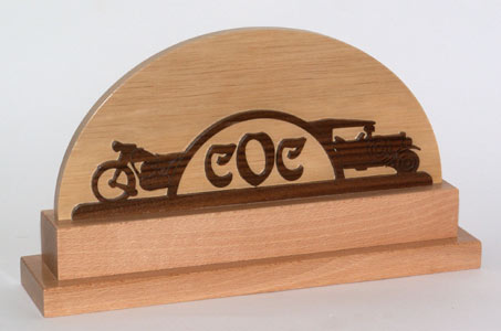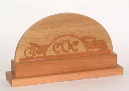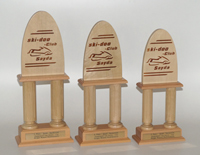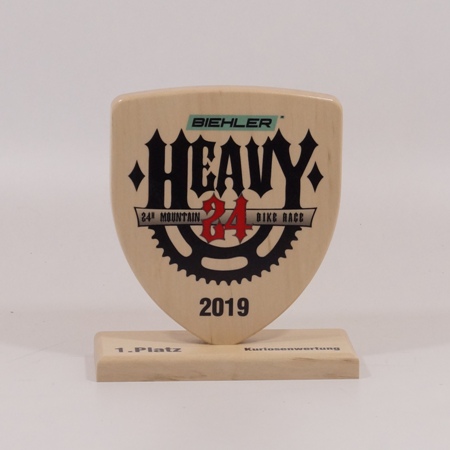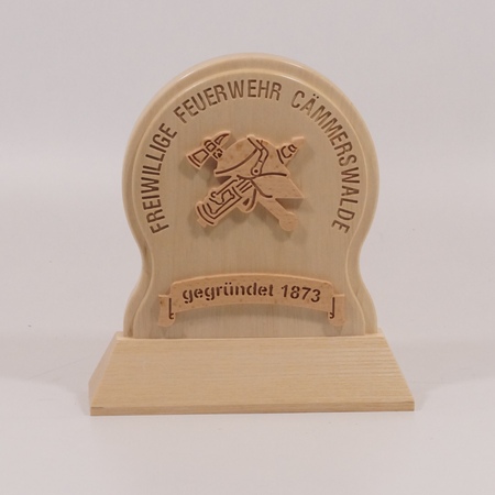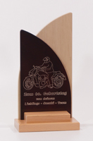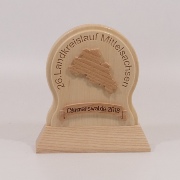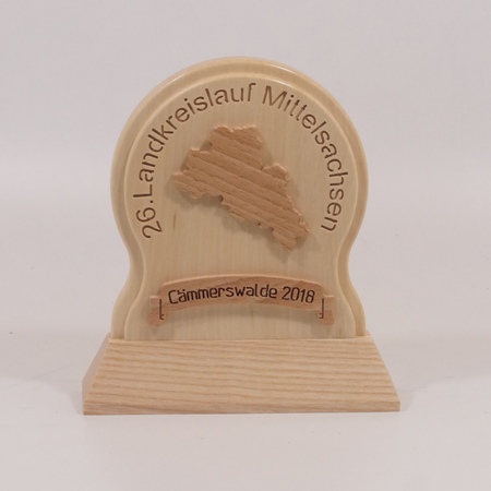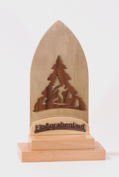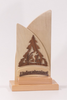 | Pokal links: Sockel Buche natur , Trägerplakette Weißbuche, Figur Kirschbaum |