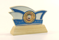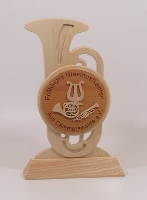 | Pokal mitte: Sockel Buche natur, Trägerplakette Weißbuche, Figur Birnbaum |